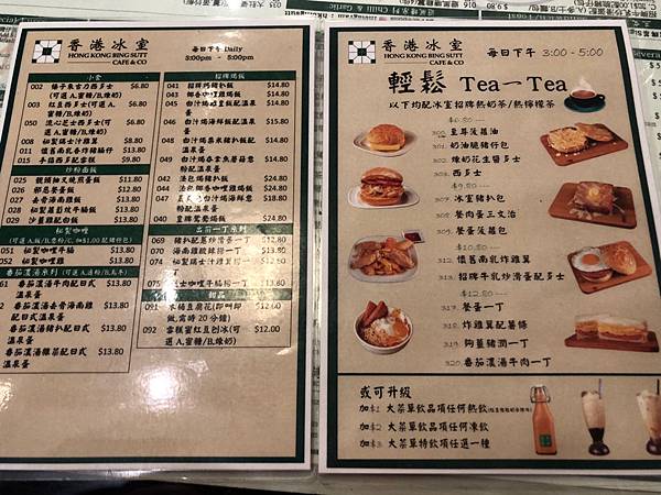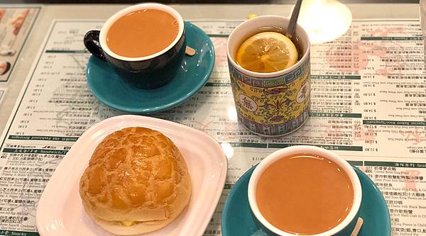 我們點了下午茶套餐,一份餐點都會搭配一杯飲料,可以是熱奶茶或是熱檸檬茶,我們點了一個菠蘿油、一份豬扒包跟一個西多士。