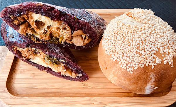 肉鬆飯糰是用紫米下去包的,裡面有肉鬆、菜脯、酸菜跟油條,紫米飯很軟Q搭配脆口的菜脯跟酸菜還有鹹甜的肉鬆!我以為我回到台灣了!