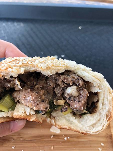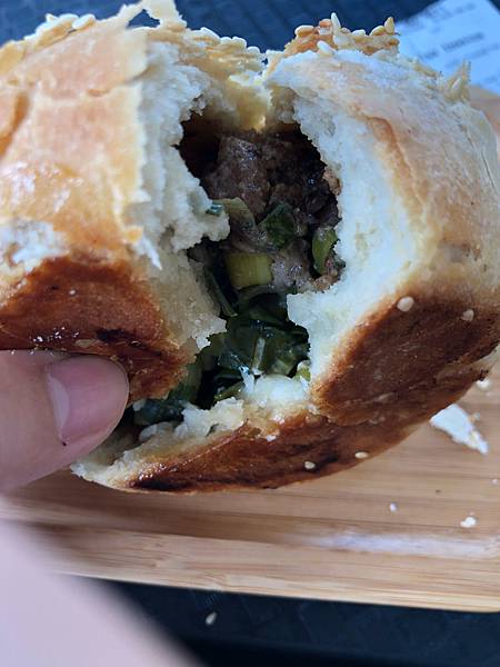 胡椒餅的餅皮較厚,口感有點像紮實的麵包,餅皮當中帶著些微的甜度搭配上內餡的蔥豬肉真的絕配,內餡的豬肉是整塊的肉塊,口感很好,醃的也很入味,完全不會有澳洲的豬腥味,蔥也給的很大方,滿滿的蔥甜味混合著胡椒香擴散在口中,難怪很多人推薦他們家的胡椒餅。