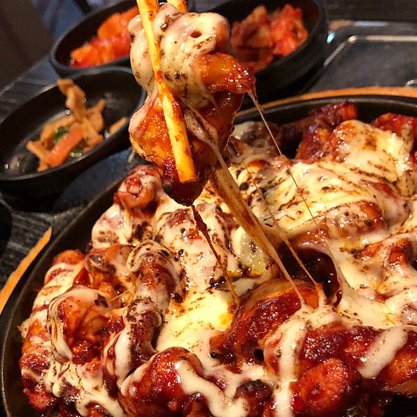 這道辣炒雞肉起司年糕,吸睛度100,口味更是💯,辣醬讓雞肉跟年糕裹的通紅,大把的起司經過烘烤融化在上面,筷子夾起雞肉起司流瀉而下,這是多麼美麗的畫面,烘烤過帶著些許的焦香味,雞肉完全不柴、年糕軟糯的口感令人著迷,但是這道菜的辣度頗高,如果不敢吃辣的朋友必須斟酌。