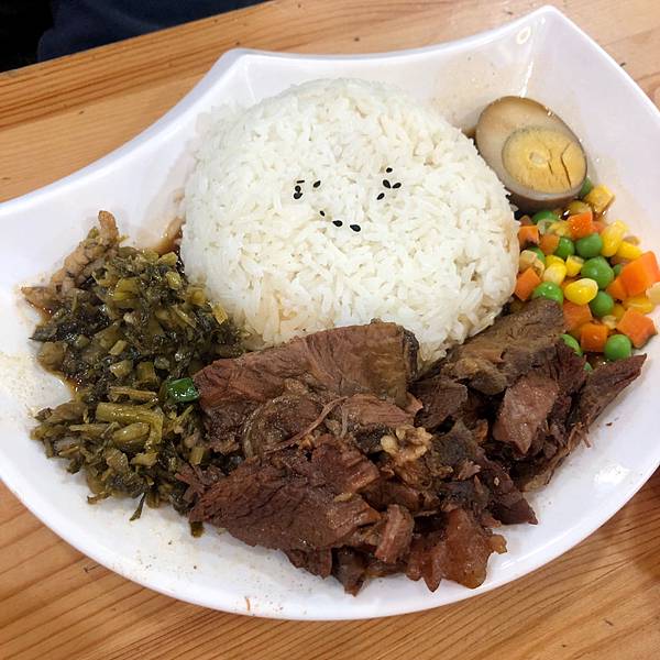 牛肉飯的部分,就是牛肉麵的麵改成飯,然後湯比較少再加上酸菜及滷蛋,酸菜搭配湯飯加牛肉真的很夠味,比起牛肉麵我覺得牛肉飯更好吃一點,但是飯是像香米一樣細長的米,所以會比較粒粒分明,還有蔬菜一樣是三色豆比較扣分。