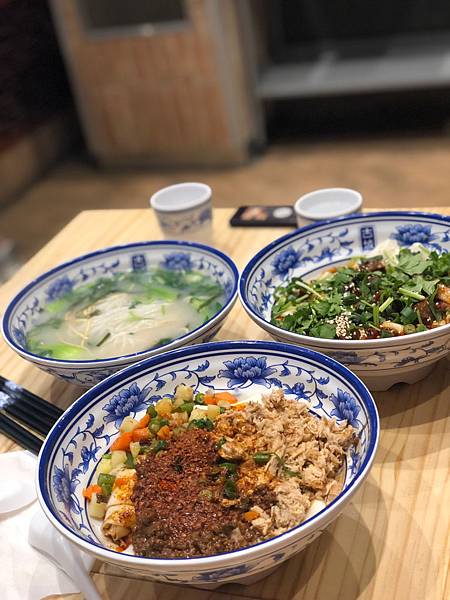 我們點了一份臘汁肉揪Biang Biang 麵片套餐跟一份香辣牛肉Biang Biang 麵套餐,另外還有一碗三鮮米線,配菜的部分就是涼拌肘片跟椒油土豆絲。