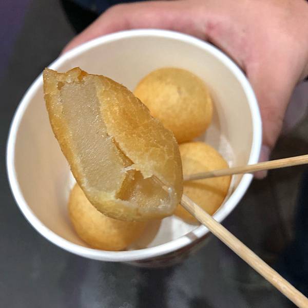 一份地瓜球有8顆,地瓜球蠻大顆的,不同於台灣的地瓜球是那種薄薄澎澎脆脆的那種,他們家的地瓜球咬下去一開始是薄脆的皮但是後面就是一整團麵團黏在一起。地瓜味沒有很重,而且整個地瓜球很吸油,所以吃起來有油耗味,讓我好失望!
