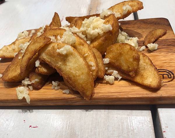 蒜香薯塊是馬鈴薯切塊下去炸,再加上鹽巴與蒜頭,蒜香與馬鈴薯甜味交融,我很喜歡👍