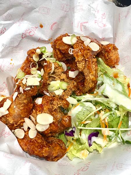 心心念念的韓國炸雞來了,因為點的菜多,所以我只點了半份的炸雞,炸雞炸的酥脆,裡面的也很多汁,旁邊的搭配生菜沙拉,邊吃炸雞邊解膩,我覺得很好吃。