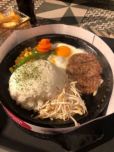 最後,漢堡排套餐,漢堡排不算大,一樣煎的多汁,旁邊的豆芽菜清脆的口感搭上白飯與漢堡排,整體吃起來好吃但普通,但是價錢很優惠,只要11塊而已,算是CP值滿高的。