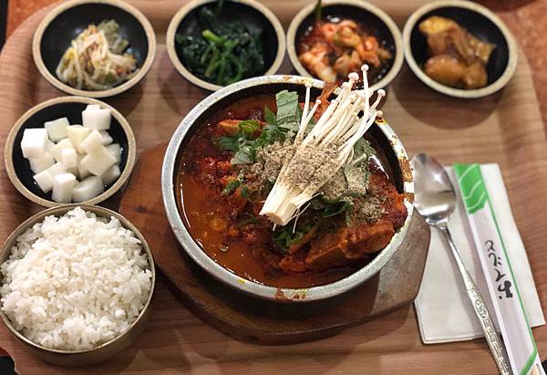 辣味豬排骨湯,有愛啃排骨的朋友就不能錯過這道了,裡面有滿滿的排骨,雖然骨頭很大塊,但在骨頭中啃肉就是骨頭迷的最愛啊!口味雖然比較重,但是配上白飯剛好。剛送上來時,鍋裡的湯還是滾燙的,冷冷的天來一鍋,真不錯,豬骨湯的小菜還比其他的多了一個醃蘿蔔,醃蘿蔔的味道很好,小菜除了泡菜之外其他味道都不錯。