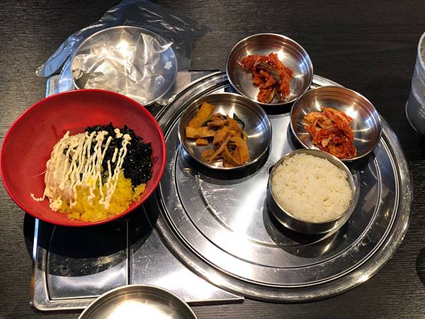 點完菜,送上了小菜以及附餐的拳頭飯,小菜每一道都蠻好吃的,蘿蔔醃的很入味,不會有生生的味道,我最愛的就是拳頭飯,將所有的配料及白飯拌勻,本來想要一個一個捏成球狀,但是一直捏不成功,所以就直接用湯匙吃,雖然形狀不完美,但是口味超棒,香氣襲人的麻油香加上海苔跟醃蘿蔔最後融合著美乃滋的滑順,超激推!