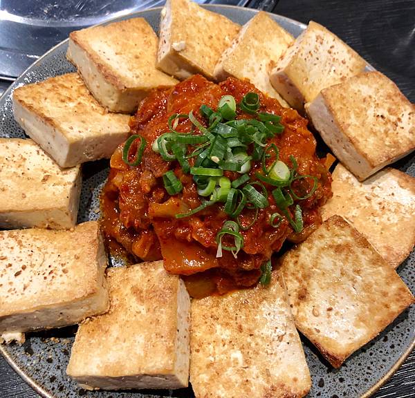 泡菜豬肉豆腐,中間的是泡菜炒豬肉配上旁邊煎的金黃的豆腐,豆腐是偏硬的那種,吃起來豆香味很香,沾著泡菜湯汁一起吃,不僅可以增加飽足感口味也很棒👍