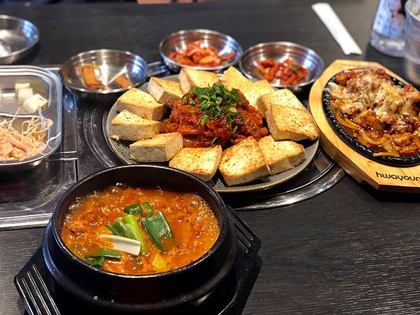 因為人數不多,所以只點了2菜一湯,起司辣炒雞,泡菜豬肉豆腐及泡菜湯。