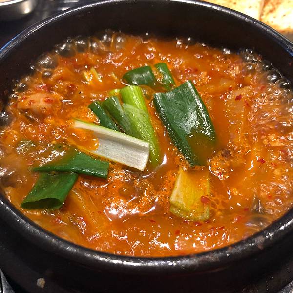 泡菜湯裡面的肉也不少,湯很濃厚,一送上來還是沸騰的樣子,我們後來喝不完還打包帶回家,晚餐加上泡麵及火鍋料跟蔬菜,還變成另外一種口味的泡菜鍋,不管是濃厚版本或是泡菜鍋版本,我都覺得很好喝。