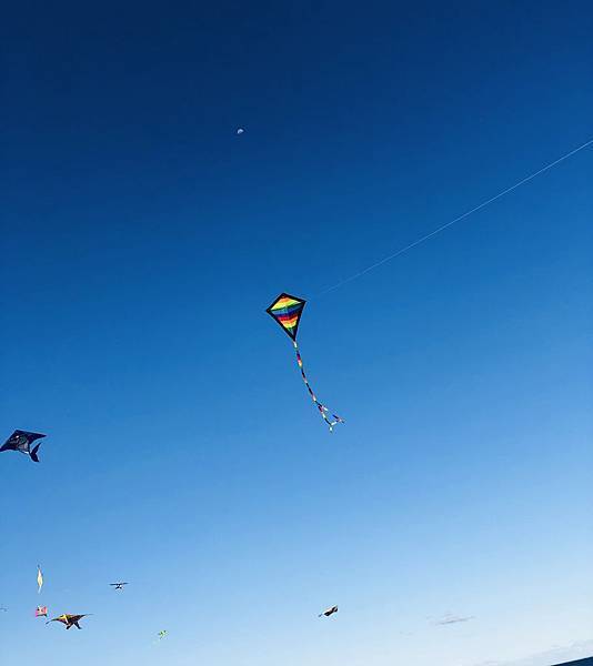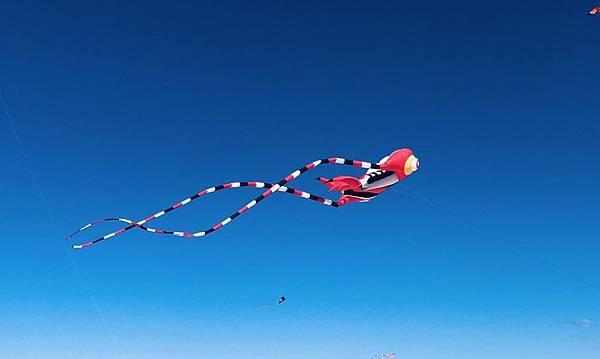 難得的風箏節,怎能錯過再一次的回味童年,在一旁的小販我買了一個小小的風箏,風箏並不特別貴,每一個金額不太一樣,隨著大小、樣式的不同,有著不同的金額。拿著我的風箏,我興高采烈的往沙灘前進,幸虧今天的風很大,所以連我這個風箏白痴也成功地將風箏放飛,這讓我又想起,童年時總是跟表弟妹一起在公園放風箏的回憶,不知不覺地感慨著歲月的匆匆。