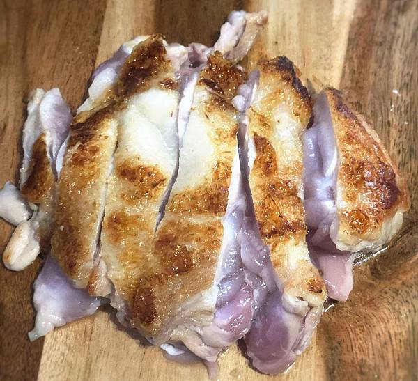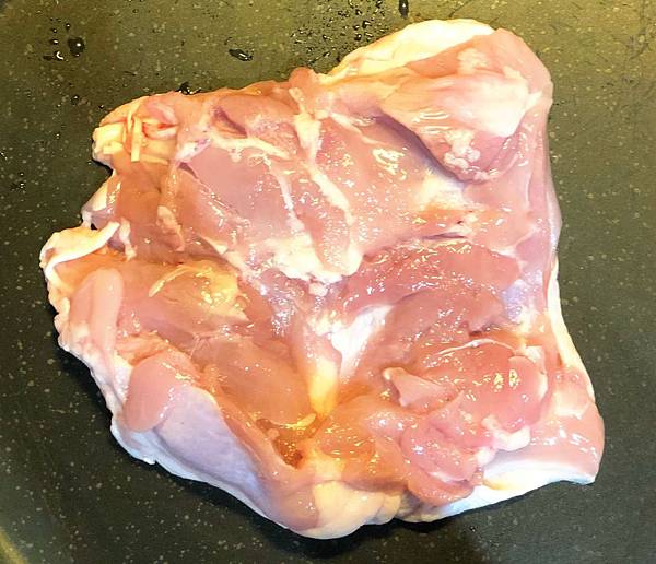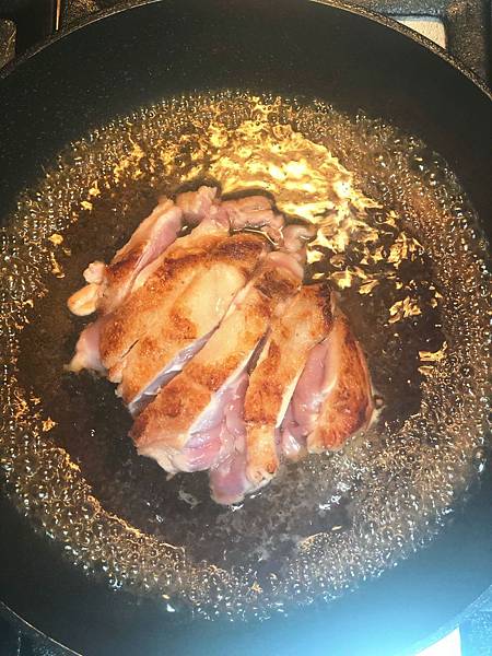 1.將雞肉的雞皮朝下,煎至雞皮金黃,取出