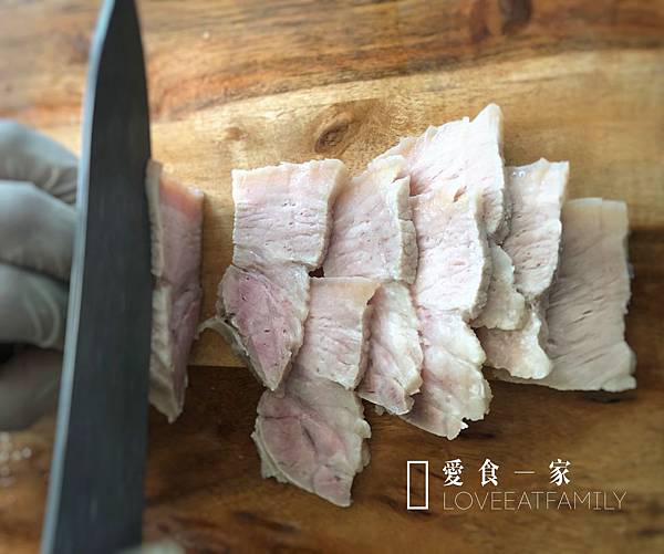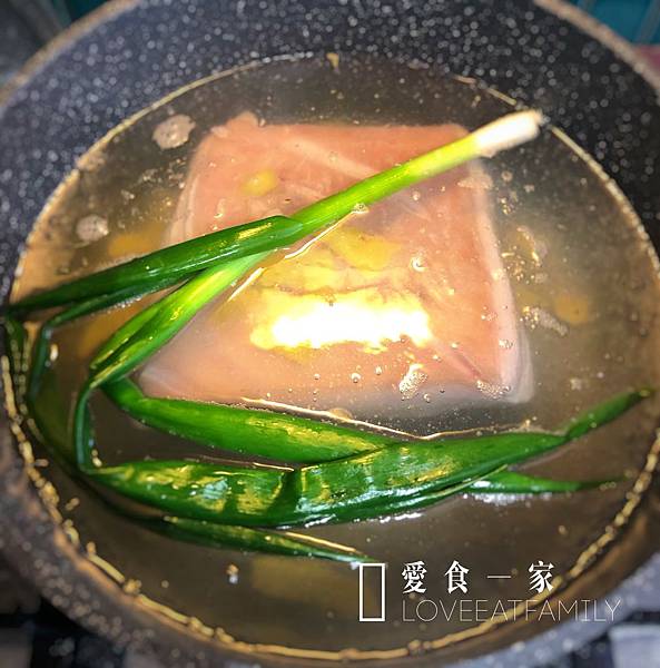 把一整塊五花肉放入鍋子,加入水、米酒、薑、蔥去腥煮熟(依照肉的大小烹煮時間不同)