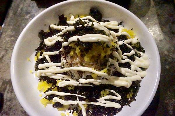 手抓飯,酥脆的海苔搭配切碎的醃黃瓜在拌入美乃滋,我們還另外加了泡菜,麻油香混雜著白飯、泡菜的味道,令人食指大動!雖然手抓飯蠻好吃的,可是因為美乃滋所以變得很容易膩,但如果是美乃滋愛好者,相信你們會很喜歡!