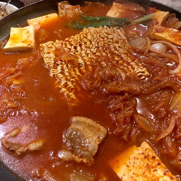 他們家料理的份量真的很大,泡菜豬肉鍋裡面有豆腐、豬五花肉、泡菜跟拉麵,豆腐跟五花肉給的份量都不少,一點都不小氣。