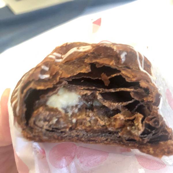 巧克力泡芙,外皮帶有少許的白巧克力當裝飾, 裡面卡士達混合著巧克力醬,濃郁的巧克力香氣滑順的在口中散開,因為我想吃看看冰過的口感,所以後來有放入冰箱,冰過之後,巧克力泡芙還是一樣好吃,還能吃到巧克力醬變成巧克力所以帶有一些脆脆的巧克力碎片,泡芙也沒有濕潤掉或是硬掉,超好吃!