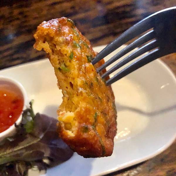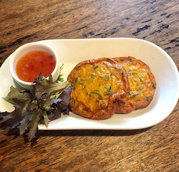 首先送上來的是Fish cake,魚漿餅帶一點香料味,外表炸的酥酥的,沾上一點泰式甜辣醬,蠻好吃的,只是我覺得有一點點乾!