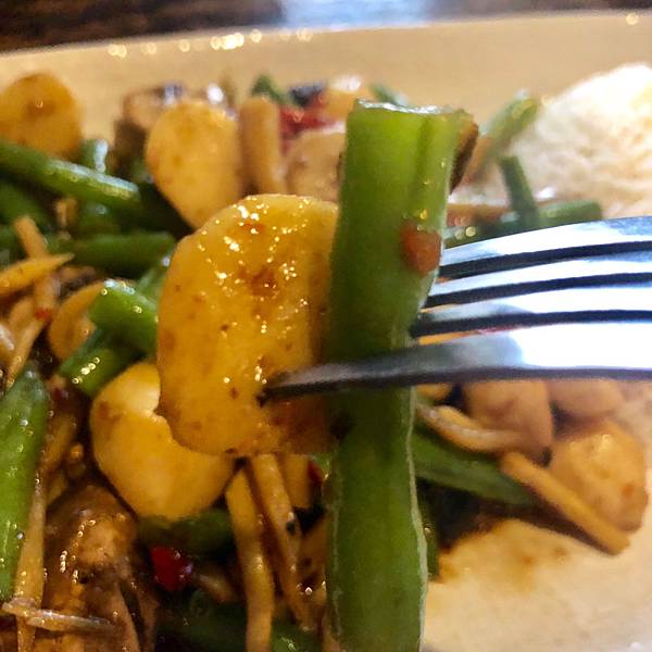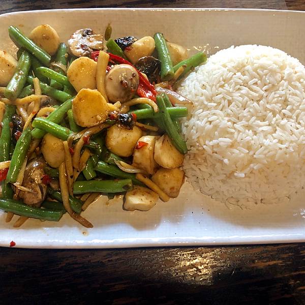 我最愛的是這道魚丸炒青菜,一開始我是最不看好他的,結果吃了一口⋯驚為天人!因為我本來就比較愛吃蔬菜,他的蔬菜炒的很入味但是又很清脆,微微的辣混合著蔬菜的甜搭配上魚丸的鮮,超級下飯啊~飯的本身也煮的很好,軟硬適中,泰國香米最怕吃到乾乾硬硬的那種,但是他們家的米很Q彈,大推👍