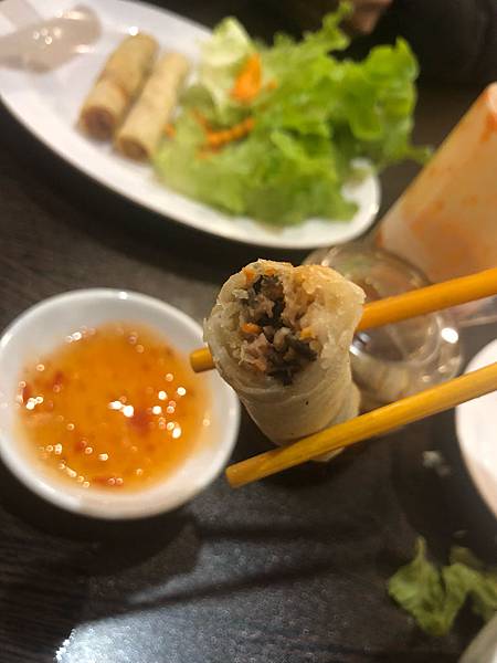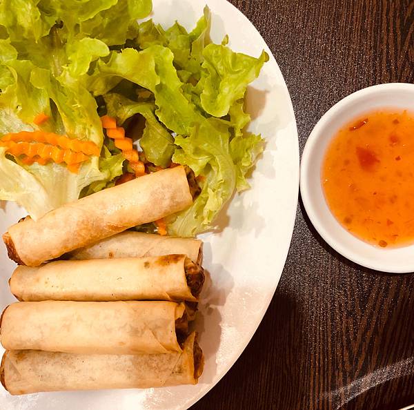 除了主食我們還點了一份春捲,春捲炸的酥酥脆脆,沾上酸酸甜甜的甜辣醬,超級配!我其實沒有很喜歡吃春捲,但是他們家的春捲我卻吃了2根, 推薦用生菜包著春捲吃,生菜的甜味讓春捲吃起來更有層次,超讚👍