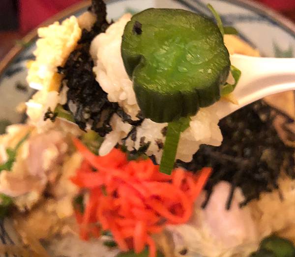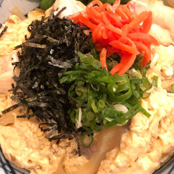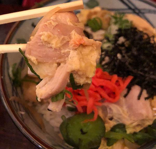 親子丼上面鋪著海苔、青蔥、醃小黃瓜跟紅薑,滿滿的雞肉跟蛋鋪在白飯上,雞肉煮的很滑嫩可口,白飯充分的與親子丼的醬汁混合,一大口吃進去,齒頰留香!真是一碗好吃的親子丼,推👍