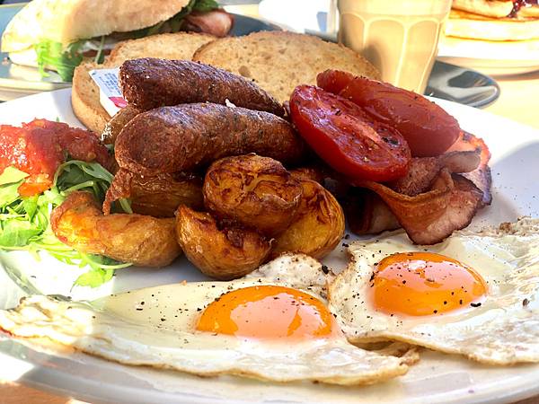 套餐真的份量頗大,但金額也不便宜,一份要價將近30澳幣,可是難得出來玩,奢侈一下,狠下心就點了,裡面有烤馬鈴薯、烤蕃茄、烤腸烤培根跟吐司還有蛋,店員會詢問你的蛋想要做什麼樣的料理,我覺得不錯,服務很好, 整體早餐好吃又吃的超飽的,以觀光區來說算是值得推薦。