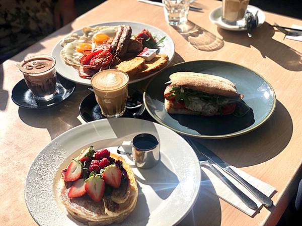 我們點了一個大套餐跟一份莓果鬆餅還有澳洲咖啡廳常見但培根蛋麵包,另外當然少不了咖啡,我們喝了拿鐵跟摩卡。