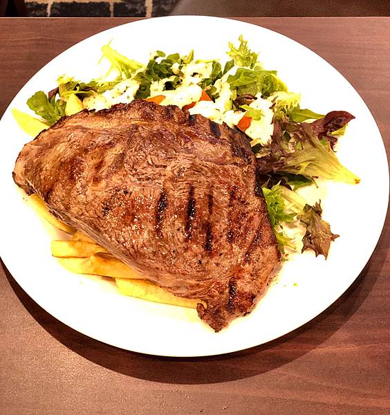 千萬別先入為主的想著,便宜一定份量少,他家的牛排是真的俗又大碗的類型,一大塊牛排比我的臉還大,再加上鋪底的薯條與生菜沙拉,健康便宜又好吃,我點的是七分熟,牛肉吃起來口感不錯,除了筋比較硬之外,其他部分都很棒,而且他家的生菜沙拉跟薯條也超好吃,推👍