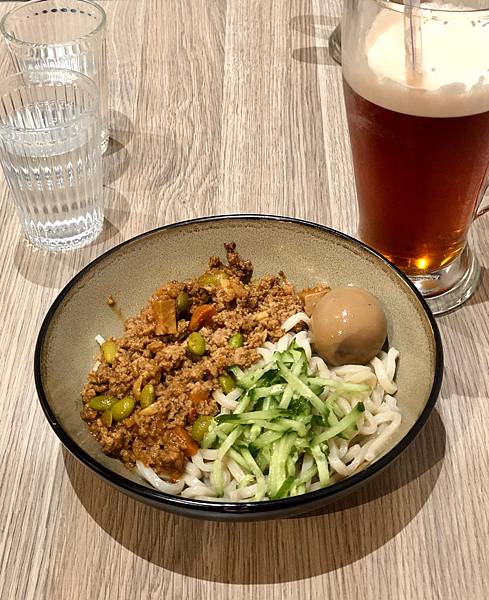 炸醬麵的麵是有嚼勁的那種,肉末加上豆腐與青豆炒成的炸醬很香,而且炸醬給的很多,好吃又不油膩,我覺得蠻好吃的,推👍
