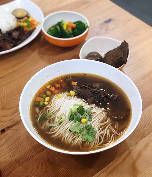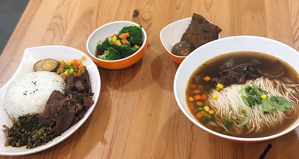 牛肉飯的部分,就是牛肉麵的麵改成飯,然後湯比較少再加上酸菜及滷蛋,酸菜搭配湯飯加牛肉真的很夠味,比起牛肉麵我覺得牛肉飯更好吃一點,但是飯是像香米一樣細長的米,所以會比較粒粒分明,還有蔬菜一樣是三色豆比較扣分。