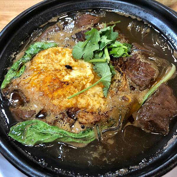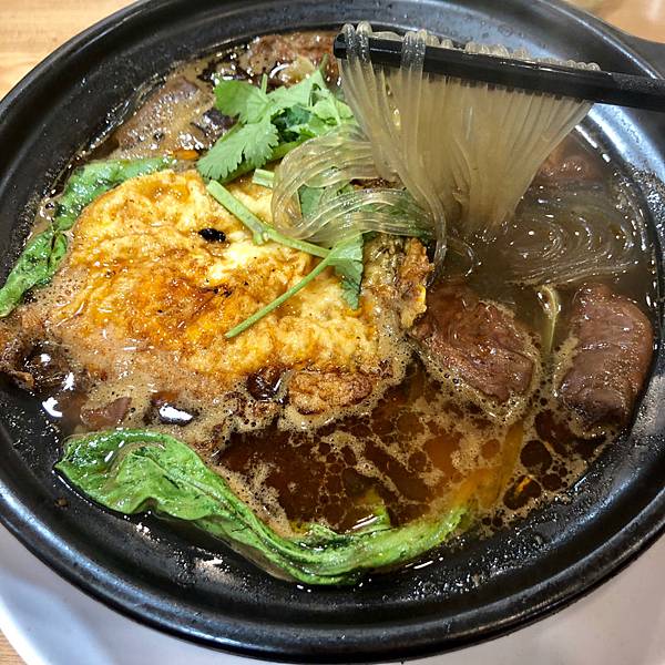 肥腸粉絲煲應該是我今天的最愛,一送上來都還在滾,在寒冷的冬天喝熱湯真的超爽,裡面有肥腸、荷包蛋、燙青菜跟粉絲,肥腸的份量很多,粗估大約有15塊左右,滷的入味又肥嫩的腸子超好吃,荷包蛋看起來是炸的很乾的那種,但是一咬開,蛋黃竟是半熟的,令我十分意外,粉絲是粗的粉絲,不太會吸湯,所以慢慢吃也不怕會越吃越多👍