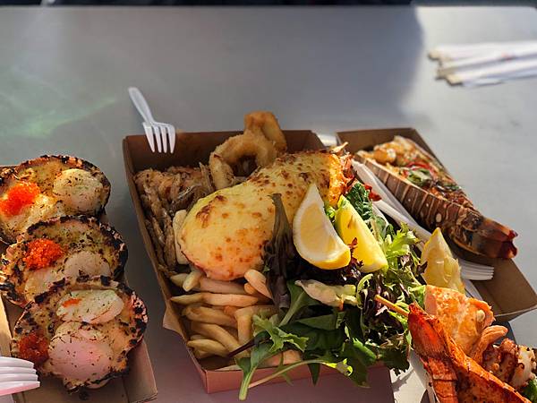 其實,我覺得點店裡搭好的套餐有點不划算,因為裡面大部分都是薯條,龍蝦套餐中的龍蝦是焗烤龍蝦,在龍蝦肉上平鋪了滿滿的馬鈴薯泥與起司,澳洲的龍蝦我覺得遜色於台灣吃到的龍蝦 ,我覺得澳洲的龍蝦很老又不鮮甜,不管是蒜蓉醬油或是焗烤龍蝦,但是個頭蠻大的,能大口吃龍蝦還是很爽,套餐中還有炸小魚乾跟炸花枝圈以及生菜沙拉,另外單點的焗烤扇貝,扇貝很大塊切成一半鋪在白飯上才焗烤,起司與白飯融合,搭上炙燒扇貝的香味,真的令我愛不釋口,好好吃。