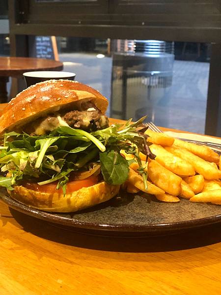 我們點了一個和牛堡,和牛堡的牛排肉多汁鮮甜,配上生菜與烤的香鬆的漢堡麵包加上起司,混合在一起的感覺令人陶醉,薯條是馬鈴薯切塊,炸的恰到好處,酥脆外皮與鬆軟的馬鈴薯,不用調味料就很好吃,讓人一口接著一口,雖然價格不算便宜,但是整體份量蠻多的,推薦👍