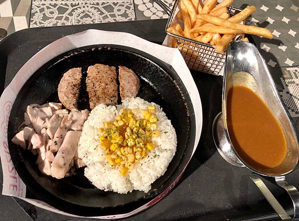 不得不說漢堡排雞肉搭上咖哩醬汁混著玉米粒與白飯,真的不錯吃,漢堡排不大塊,但是煎的挺多汁的,不會乾澀,雞肉蠻嫩的,咖哩醬就是日式咖哩的味道,不會太濃,我蠻喜歡的。