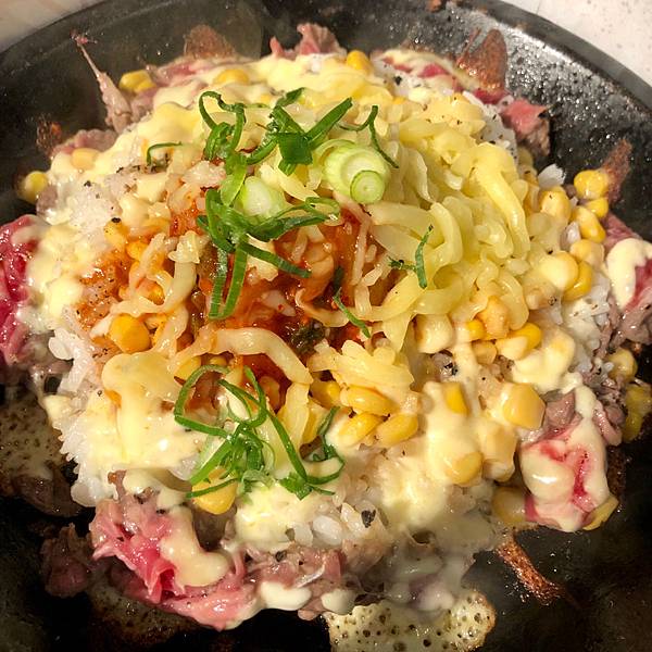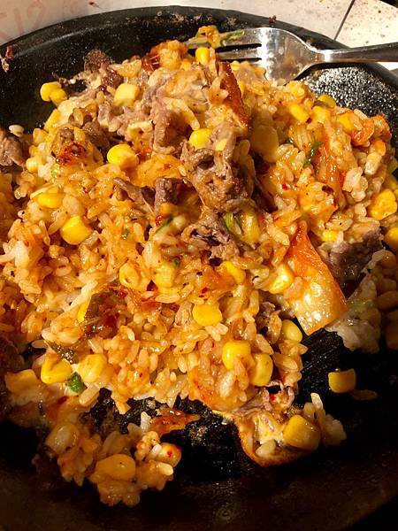 泡菜起司牛肉飯,白飯上蓋著粉嫩粉嫩的生牛肉,上面鋪上玉米粒在加上泡菜,最後再灑上起司,起司在熱熱的鐵盤上滿滿融化,迅速的將所有配料拌一拌,融化的起司與泡菜跟白飯交融,泡菜吃起來的酸辣味都被中和了,因為口味比較重,所以還是會吃膩,這時候玉米粒就派上用場了,當你覺得膩時,清甜的玉米粒可以帶走口中的重口味,彷彿一道清流洗滌了嘴裡濃厚的感覺,推薦給愛吃泡菜跟起司的朋友。