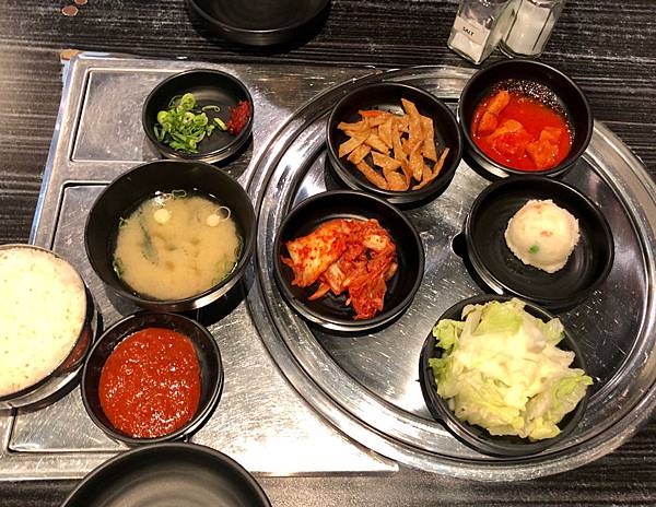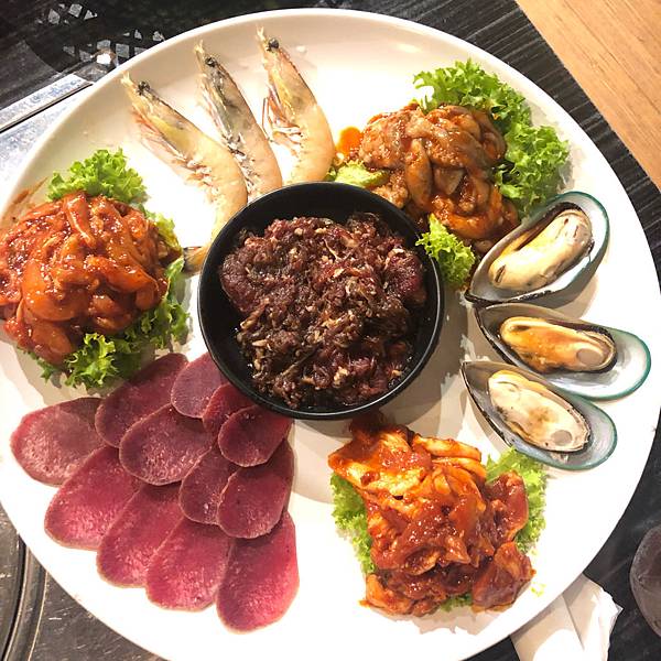 韓式燒肉拼盤,除了牛舌,其他的肉都是醃過的,份量大約是3人份,除了蝦子不是非常新鮮之外,其他的食材我覺得都挺不錯的,烤到滋滋作響的肉夾進生菜內再加上泡菜跟辣醬,一口塞進嘴裡,清脆的生菜、甜甜辣辣的醃肉及泡菜,超好吃👍