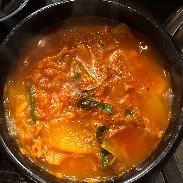 泡菜豆腐鍋,口味適中,不會過鹹過辣,軟嫩的豆腐跟泡菜湯天衣無縫的組合,邊吃燒肉邊喝熱湯,超讚的~