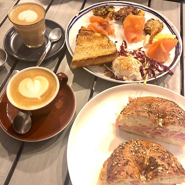 我們點了一份櫛瓜玉米餅套餐跟火腿起司貝果,一杯拿鐵咖啡跟一杯Flat white。