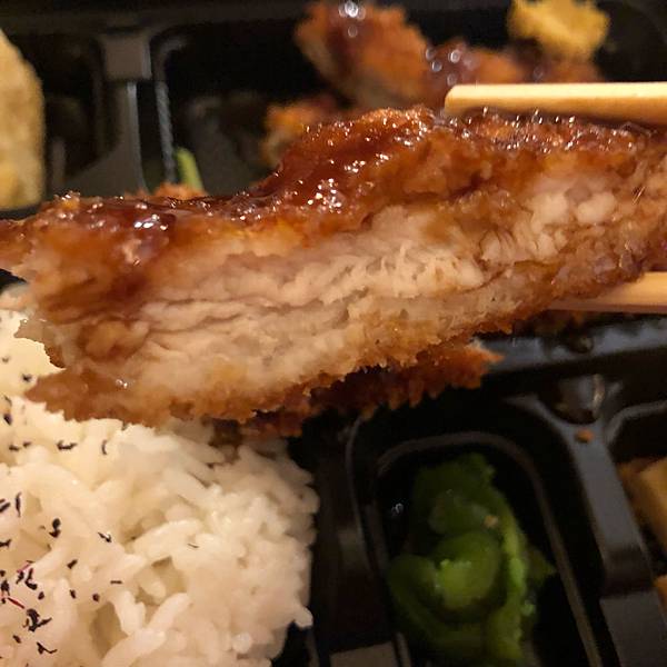 炸豬排便當,搭配日式炸豆腐跟玉子燒,很日本的味道,日式炸豆腐的面衣不會很厚,吃的到豆腐的紮實跟豆香味,玉子燒香香甜甜,味道就像是我在日本吃到的玉子燒一模一樣,最驚豔的就是炸豬排了,香嫩酥脆的炸豬排淋上豬排醬,咬上一口再扒進一口白飯,肉汁混雜著米飯的香味衝擊著你的味蕾!真的超級好吃,大推👍