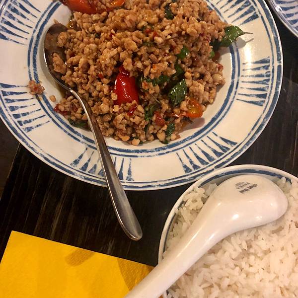 我們當天是兩個人用餐,朋友上次有來過,他很愛他們的打拋雞,所以今天又點了一次,另外再加一碗白飯,他說光是打拋雞就可以讓他吃掉3碗飯,我吃了一些,味道還真是不錯,香香辣辣的打拋雞混合著白飯,米飯粒粒分明不會太乾,份量超大,大約可以讓兩個人吃一份打拋雞跟白飯(1碗),如果不能吃很辣的朋友要跟店家說一下,不然他們的打拋雞真的蠻辣的。