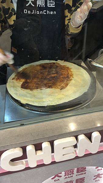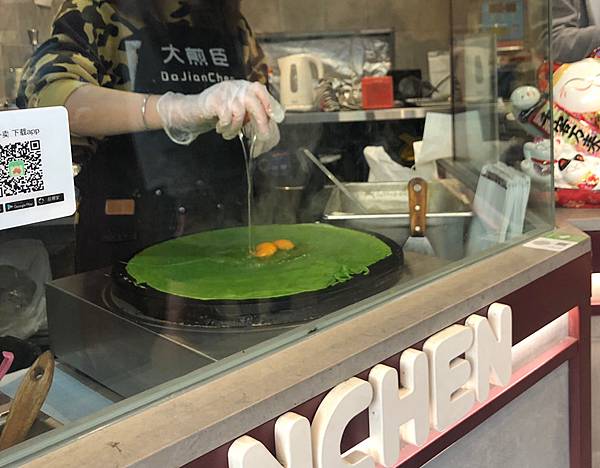 每一份煎餅果子都是新鮮現做,只隔著玻璃,衛生由自己把關,我覺得不錯,只見店員流利的動作,先是抹平麵糊、打上兩顆蛋並打散平均分佈在麵皮上,接著灑上蔥花及黑芝麻然後翻面刷上醬及加上配料,再將煎餅捲起,一份新鮮的煎餅果子就完成了!