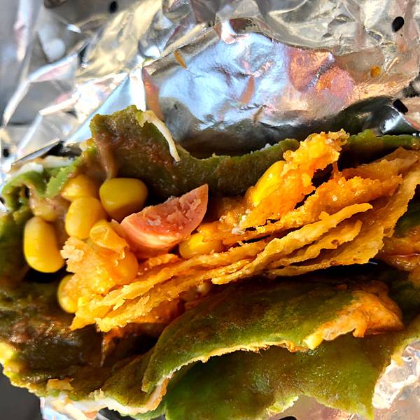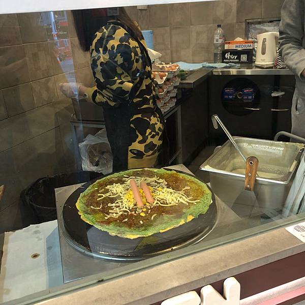 我們一共點了兩種口味,一個是菠菜另一個是玉米,煎餅果子的基礎有包含兩個雞蛋、4片薄脆跟一根火腿腸,我們還加了起司跟玉米,每加一種材料+1塊,一份煎餅果子平均$9.8澳幣再加上配料,輕輕鬆鬆就超過10元了,說實在的頗貴。